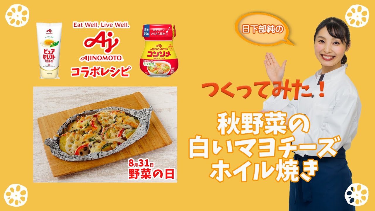 JA水郷つくばの日本一のれんこんを使った簡単で美味しいレシピをご紹介。味の素のピュアセレクトマヨネーズと味の素KKコンソメ顆粒を使った「秋野菜の白いマヨチーズホイル焼き」をれんこんチャンネルナビゲーター 日下部純さんが作ってみました!詳しい...